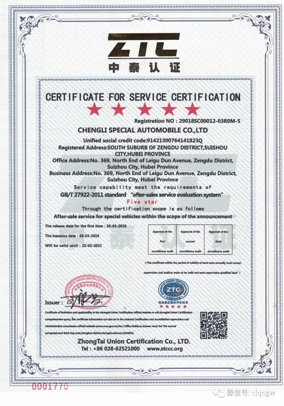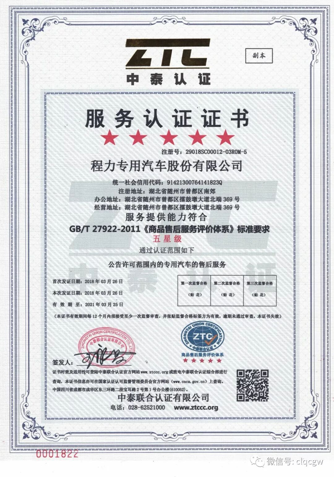 获得五星级售后服务认证的证书如下:
